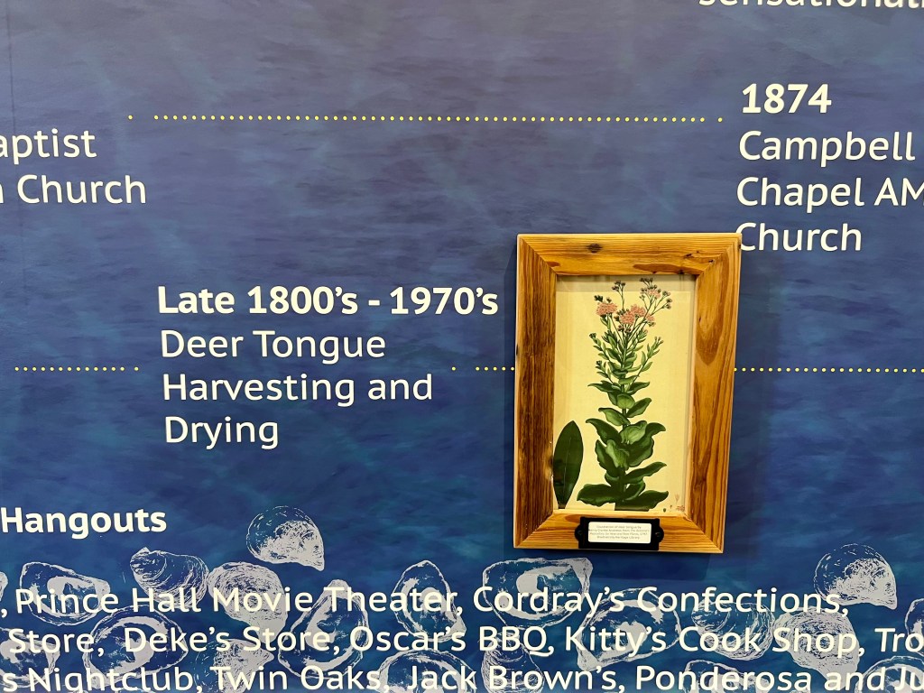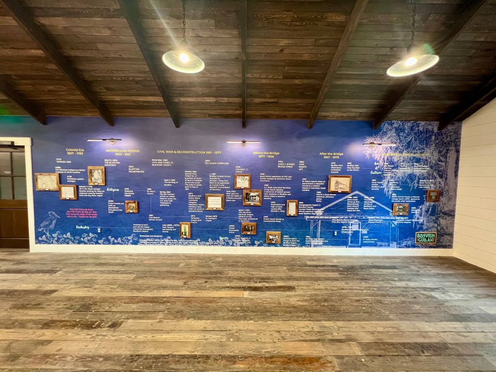 The story wall features a chronological journey through Bluffton’s history, beginning with indigenous peoples and flowing through the plantation era, Civil War, Reconstruction, and into contemporary times. The timeline is enhanced by photographs housed in frames crafted from reclaimed wood from the historic Deer Tongue building. Against a textured indigo backdrop, ethereal white silhouettes of Lowcountry icons—live oaks, oyster shells, herons, and a praise house—evoke the aesthetic of traditional cyanotype photography. This artistic technique, which creates white impressions against deep blue backgrounds through sun exposure, mirrors how Gullah culture has left its lasting imprint on Bluffton’s identity.